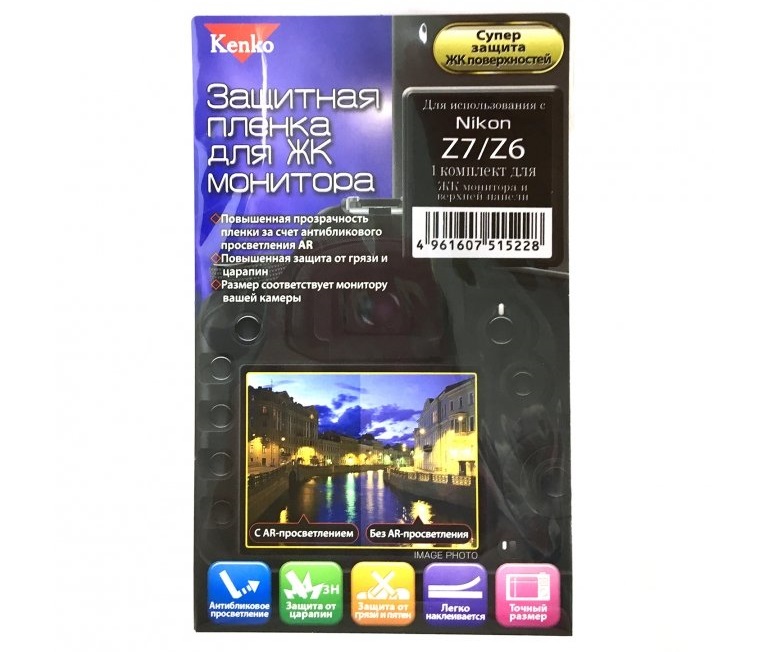 1 комплект для ЖК монитора и верхней панели. Для использования с Nikon Z9. Защитная пленка Kenko имеет отличную светопропускную способность, за счет которой значительно уменьшаются блики и отражения, изменяющие фотографии, сделанные цифровой камерой. Так же она защищает ЖК-дисплей камеры от грязи, царапин и жировых отпечатков. Механизм наклейки пленки прост и удобен, её без труда можно наклеить на поверхность дисплея. Защитная пленка Kenko для ЖК-дисплея с антибликовым просветлением AR. Представляет собой базовый слой с нанесенным на его поверхность твердым образующим слоем с многослойным диэлектрическим просветлением. Твердый слой имеет показатель твердости 3H. Благодаря многослойному диэлектрическому просветлению два вида отраженных световых волн перекрывают друг друга, снижая при этом бликование на внешней поверхности пленки и в то же время пропуская выходящий свет с обратной стороны. Если смотреть на дисплей, защищенный пленкой Kenko, то отражения внешних предметов практически не видно, при этом изображение не теряет яркости и четкости. Разница двух видов просветления в том, что сухое просветление имеет более высокие показатели светопропускания. В производстве защитных пленок применяются 2 вида просветления: мокрое и сухое. Защитная пленка Kenko использует сухое просветление, тогда как другие японские производители используют мокрое. Сухое просветление представляет собой слой из микрочастиц железа, нанесенных на поверхность пленки. Мокрое просветление представляет собой напыление веществ, растворенных в особой жидкости. Структура просветления защитной пленки Kenko включает 4 слоя: 1 твердый образующий слой + 2 слоя из микрочастиц железа + 1 грязезащитный слой. При этом грязезащитный слой представляет собой автономную структуру.
