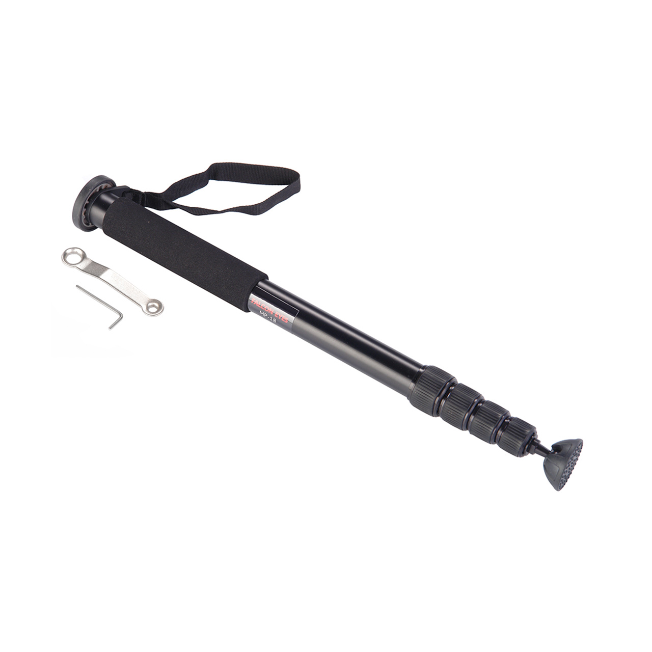 Falcon Eyes MP-18 — легкий, высокий, пятисекционный монопод, предназначен для установки камер весом до 8 кг. Использование монопода имеет ряд преимуществ относительно штатива: малый вес, компактные размеры и мобильность в работе. Возможна установка штативной головы с установочной резьбой 3/8" или 1/4", диаметр площадки под штативную головку — 55 мм. Рекомендуется устанавливать на монопод штативные шаровые головы серии BH. Пять секций монопода обеспечивают широкий диапазон регулировки рабочей высоты, а благодаря большому диаметру секций (диаметр верхней секции 32 мм) и надежным цанговым зажимам сохраняется прочность конструкции. Металлические зажимы с фторпластовыми прокладками обеспечивают долговечность работы и прочную фиксацию секций. Максимальная высота в рабочем состоянии 189 см позволит проводить съемку с верхних точек. Достаточно компактный в сложенном виде, всего 53 см. Монопод изготовлен из легкого алюминиевого сплава и весит 0,62 кг. Шарнирная опора имеет возможность свободного вращения вокруг оси монопода на 360 градусов. В основании опоры находится U-образный вырез, который позволяет производить наклон монопода на угол до 90 градусов. Рукоятка из вспененного материала служит для комфортной работы при отрицательных температурах и прочного удерживания без проскальзывания. Монопод снабжен ремешком для фиксации на руке, это предупредит падение монопода с камерой, если фотограф случайно выпустит его из рук.