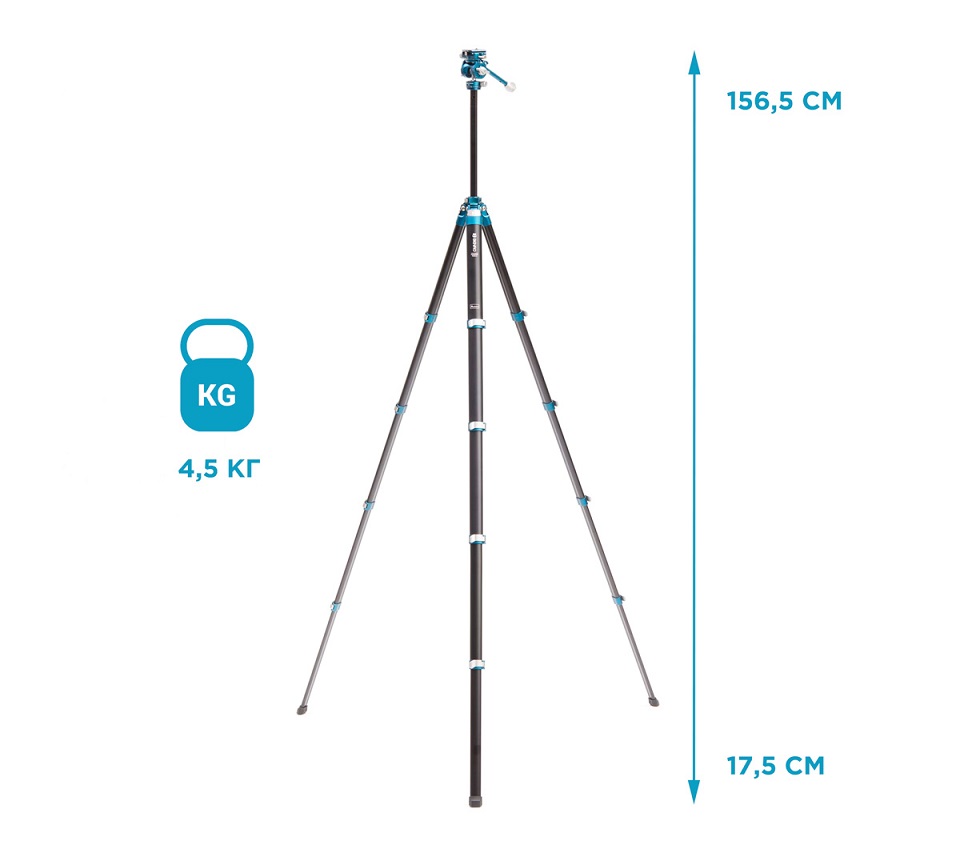 Ноги изготовлены из легкого и прочного алюминия, что позволило получить очень легкий штатив: всего 1.22 кг. Секции штатива в сечении имеют эллипсовидную форму. За счет этого в сложенном виде штатив чрезвычайно тонкий, всего 5.7 см. Перемещаясь от одной локации к другой, не обязательно убирать штатив в чехол, сложенные ноги в диаметре не больше банки с напитком, что удобно для переноски в руке. Надежные алюминиевые клипсовые замки в закрытом виде не выступают за приделы штатива и не увеличивают его объем. Эргономичная форма замков позволяет одной рукой открыть все секции штатива и быстро установить его в рабочем положении. Клипсовые замки – это не только самый быстрый способ фиксации, но и визуальный контроль закрытия всех секций.