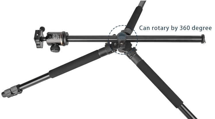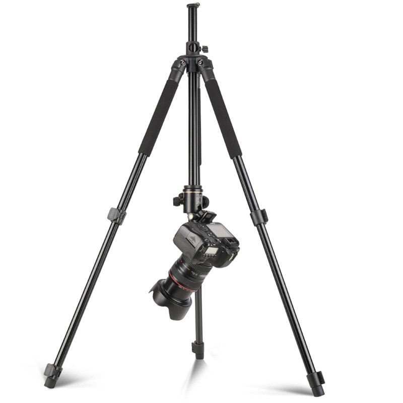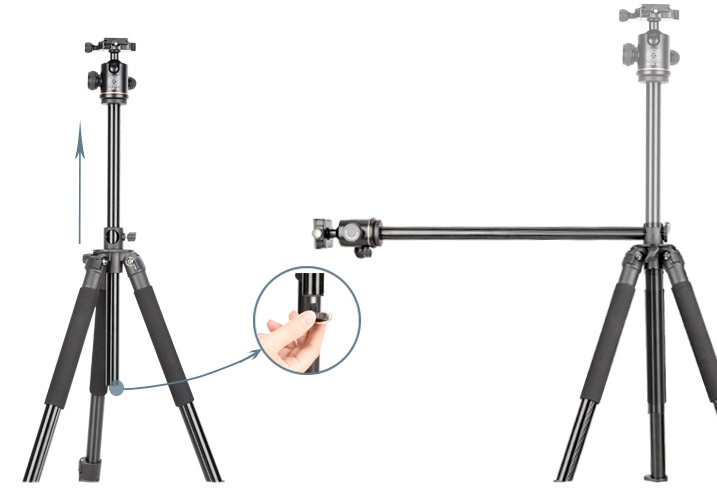 Центральная колонна может переворачиваться для съемки объектов с нижней точки или съемки макро. Есть крюк для подвеса груза. Штатив идеально подходит для DSLR и видеокамер.