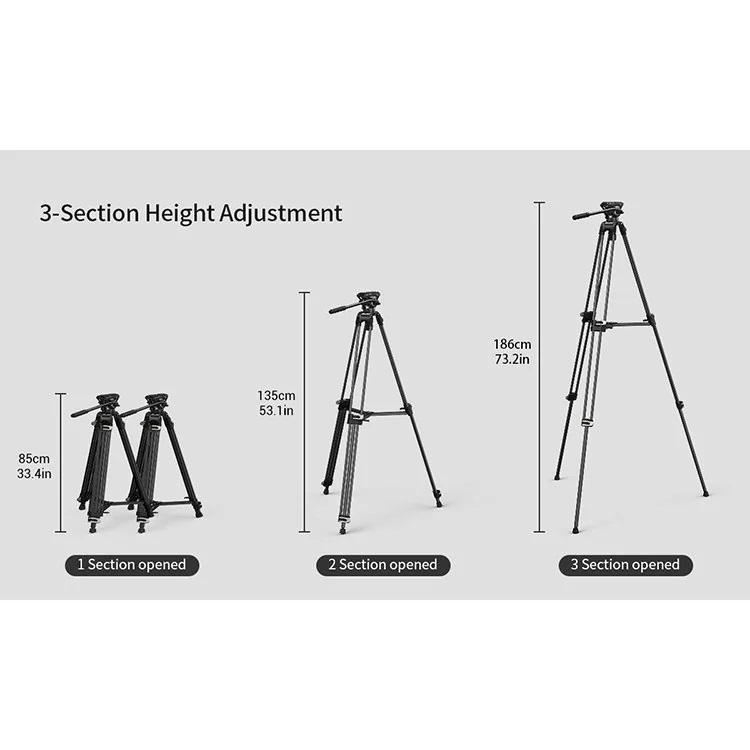 Укрепленный штатив с чашей 75мм в основании и жидкостной видеоголовой. Имеет максимальную нагрузку в 8 кг, а наличие трех секций позволяет подобрать необходимую высоту трипода в диапазоне от 85 до 186 см.