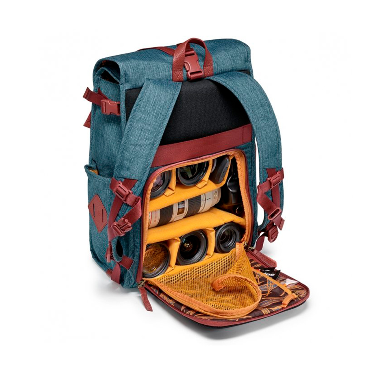 Прочная водоотталкивающая ткань идеально сочетается со вставками из натуральной кожи и фирменной винтажной фурнитурой. Внутренняя часть снабжена яркой эвкалиптовой печатью, напоминающей ландшафты Австралии. Внутренние разделители снабжены системой защиты Manfrotto. В рюкзаке предусмотрен доступ к оборудованию со стороны спины. Расположение: DSLR камера с установленным объективом 70-200/2.8, до пяти дополнительных объективов и аксессуаров. Дополнительный боковой доступ позволяет быстро достать камеру. Защитные вставки съемные, удалив их, рюкзак можно использовать как повседневный. Боковое крепление штатива, внутренние и внешние карманы, отделение для ноутбука до 15 дюймов. Мягкая, дышащая ткань на спине и лямках. Ремень для установки на тележку или чемодан на колесах. Ремни для фиксации рюкзака на груди.