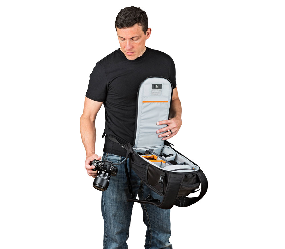 Обновленная версия рюкзака Flipside 200 AW II подходит для зеркальной камеры (без батарейной ручки) с объективом до 70-200 мм f/2.8 + еще 2 небольших объективов, также подходит для компактного беспилотника типа DJI Mavic Pro или Mavic Air со всеми необходимыми аксессуарами. Доступ ко всему оборудованию осуществляется через спинку, что делает безопасным перемещение в «туристических» местах и на общественном транспорте, где часто орудуют уличные воры. При использовании поясного ремня доставать и укладывать содержимое можно прямо на весу, не пачкая рюкзак.