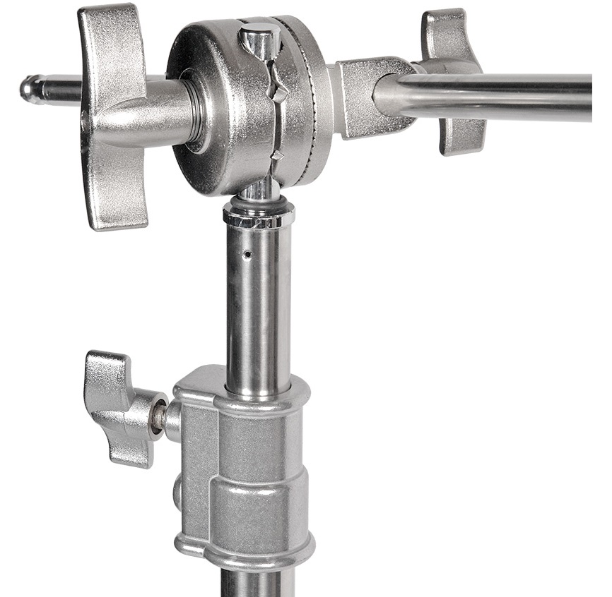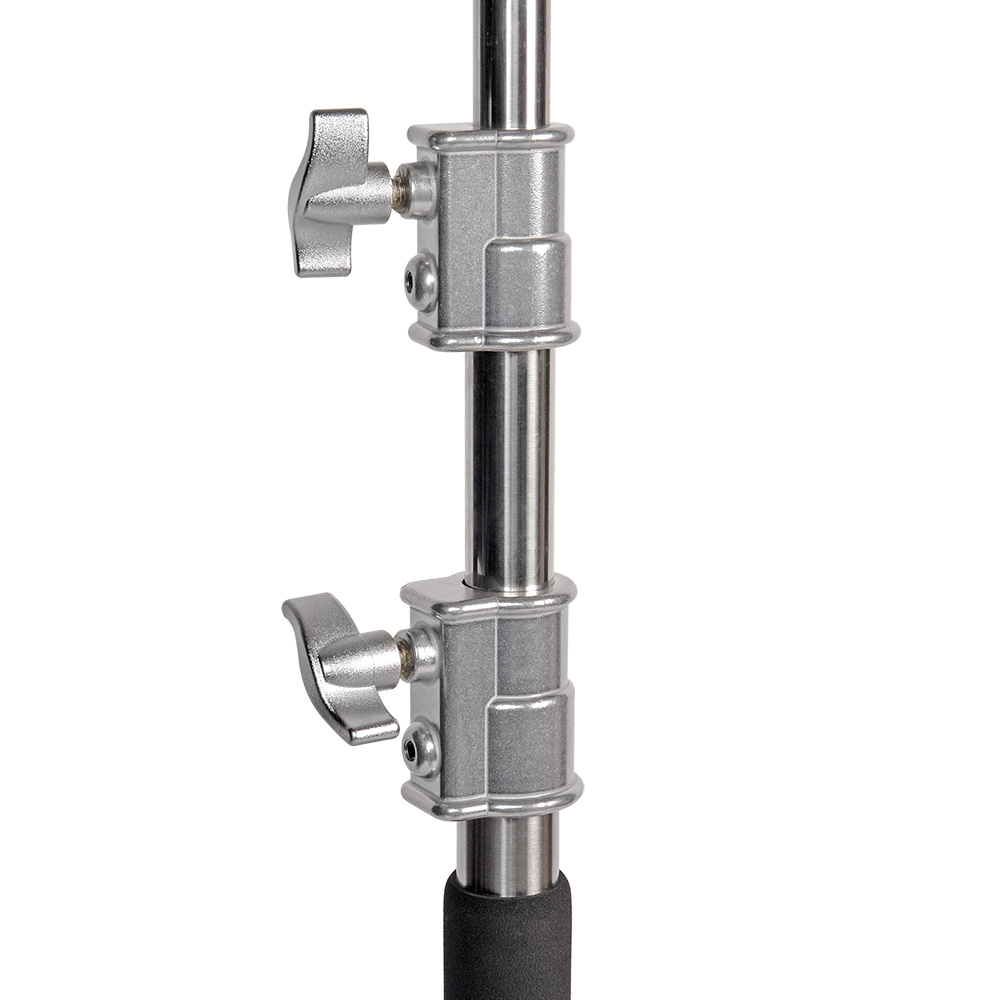 Секции стойки оборудованы пружинными амортизаторами. Диаметр секций стойки - 35, 30, 25 мм. Верхняя секция снабжена пальцем диаметром 5/8“, на который, с помощью комплектной муфты, можно установить перекладину(экстеншн) или другое оборудование весом до 10 кг. Стойки серии C-Stand хоть и являются максимально устойчивыми, тем не менее рекомендуется утяжелять их основания с помощью дополнительных грузов.