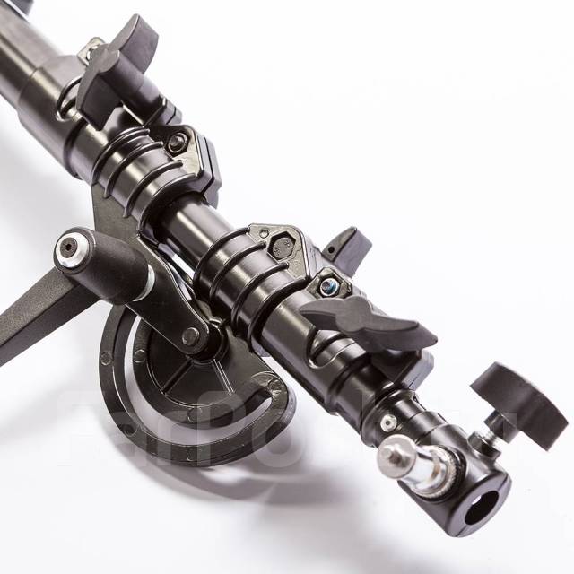 Стойка-журавль изготовлена из прочного алюминиевого сплава, безопасная нагрузка составляет 3 - 5 кг (в зависимости от степени выноса). Высота регулируется в пределах от 1.3 до 2,2 метров, длина журавля – от 1.1 до 1.8 метра. В качестве противовеса используется сумка для балласта. Сам балласт (например, песок, не входит в комплект).