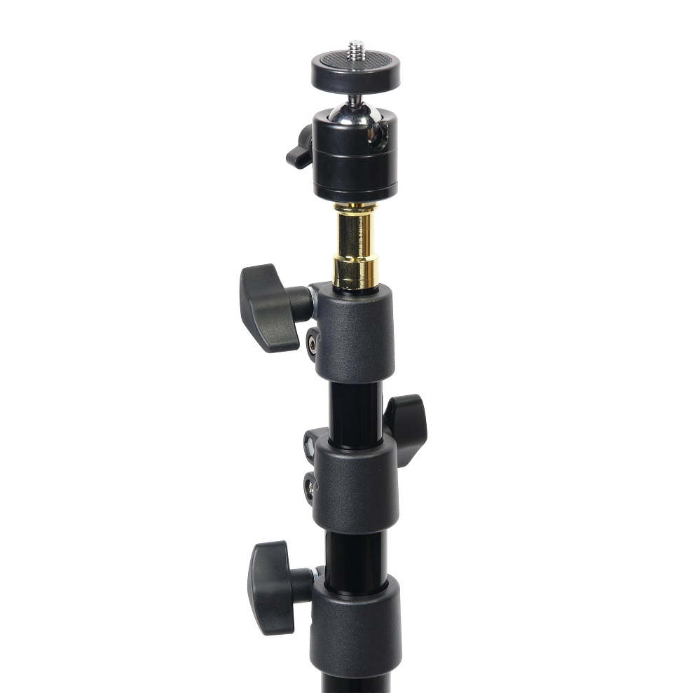 Несъемный латунный шпигот 5/8” (с винтом 1/4”) прикреплен на конце 4-секционной телескопической трубы стойки. К шпиготу может крепиться комплектная шаровая головка также с винтом 1/4” на конце. Оборудование, установленное на шаровую головку, может вращаться вокруг своей оси на 360° и наклоняться вперед в пределах 90°.