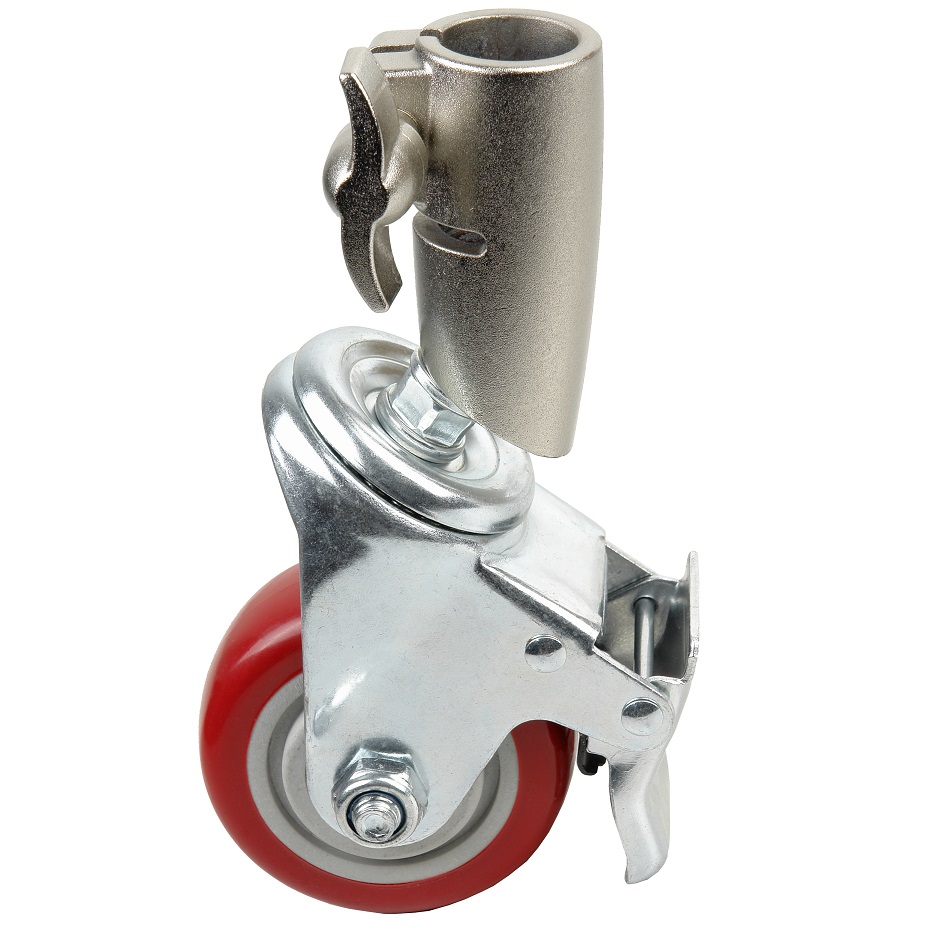 Колеса с помощью втулки с винтовым зажимом закрепляются на ногах тяжелой осветительной стойки и позволяют без усилия перемещать по студии установленное на ней оборудование. Полезная нагрузка на колеса – 70 кг.
