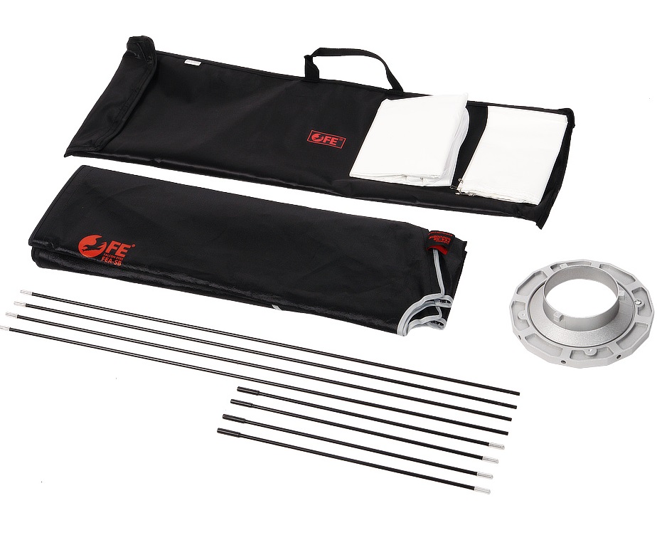 Устройство состоит из отражателя, внешнего и внутреннего рассеивателя, несущего каркаса (литой алюминиевый адаптер и сменное байонетное кольцо на Bowens). Для установки FEA-SB 50200 BW на осветительные приборы с другим байонетом можно использовать переходные кольца (приобретаются отдельно, диаметр 145 мм).