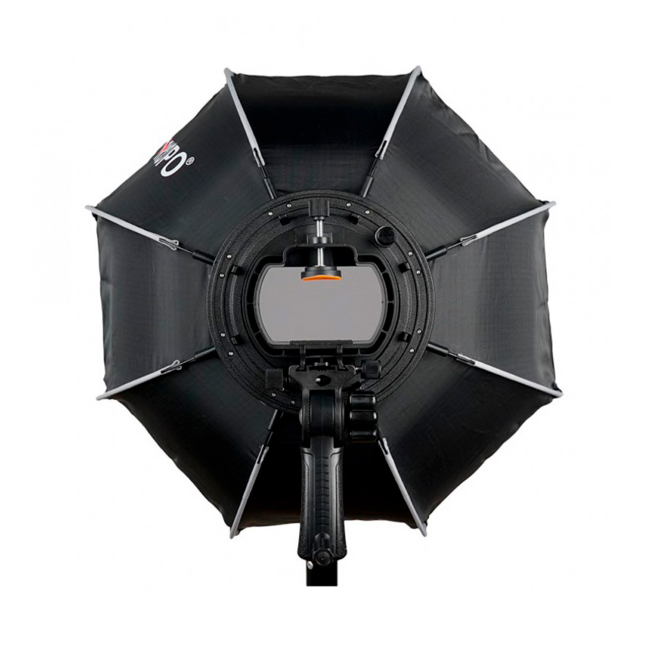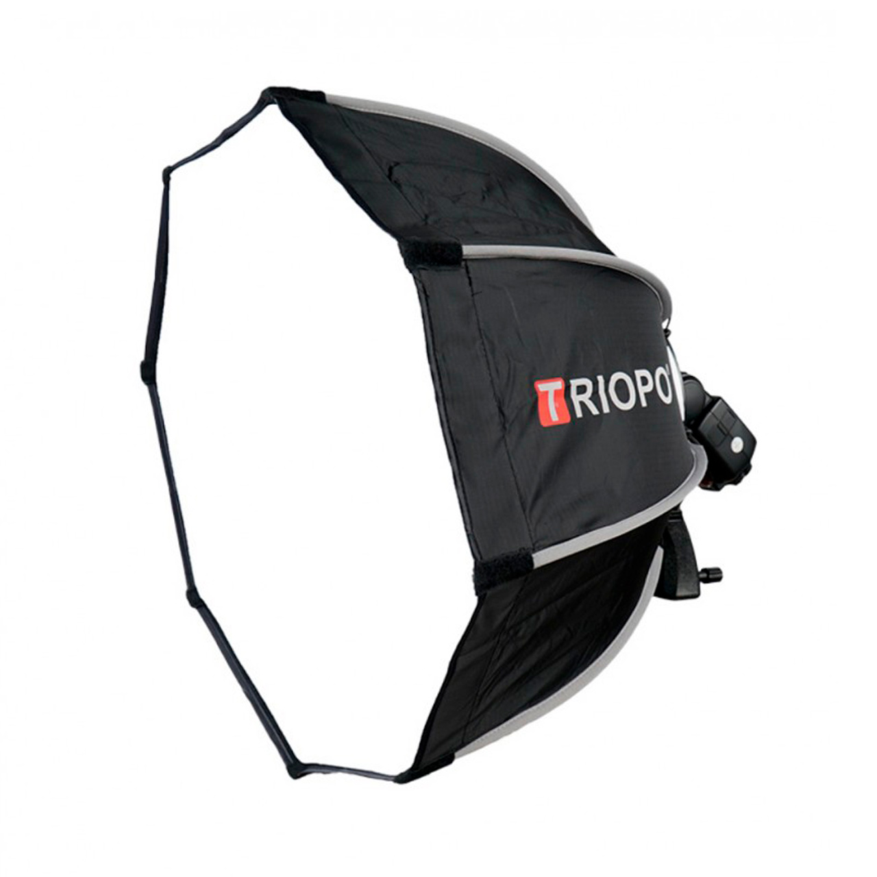 Октабокс TRIOPO KS55, 55см, быстроскладной, с креплением для накамерной вспышки. Очень удобный в использовании, легко и быстро собирать и разбирать. Металлические спицы закреплены снаружи октабокса и фиксируются в пазы на защелки, что облегчает процесс сборки. Фиксируя спицы в пазы октабокс принимает жесткую конструкцию. За счет не съемных спиц времени на сборку тратится меньше. Внутренняя поверхность имеет серебристое покрытие, которое выполняет роль светоотражателя. В комплекте идут два белых тканевых диффузора, которые крепятся за счет липучек. С помощью направляющих и фиксатора к корпусу октабокса крепится специальная ручка. Специальным винтом можно регулировать угол наклона ручки. В корпусе ручки есть гнездо для установки октабокса на стойку. Вспышка устанавливается в центр октабокса и фиксируется прорезиненными винтами-зажимами. Октабокс TRIOPO KS55 имеет оптимальные размеры для использования в любых помещениях и студиях. Отлично подходит для предметной съемки и портретов. Быстроскладной, компактный октабокс TRIOPO подойдет для выездной съемки такой, как свадебная, клубная, репортажная. Размеры и быстрая сборка позволяют легко и быстро перевозить его в сумке-переноске.