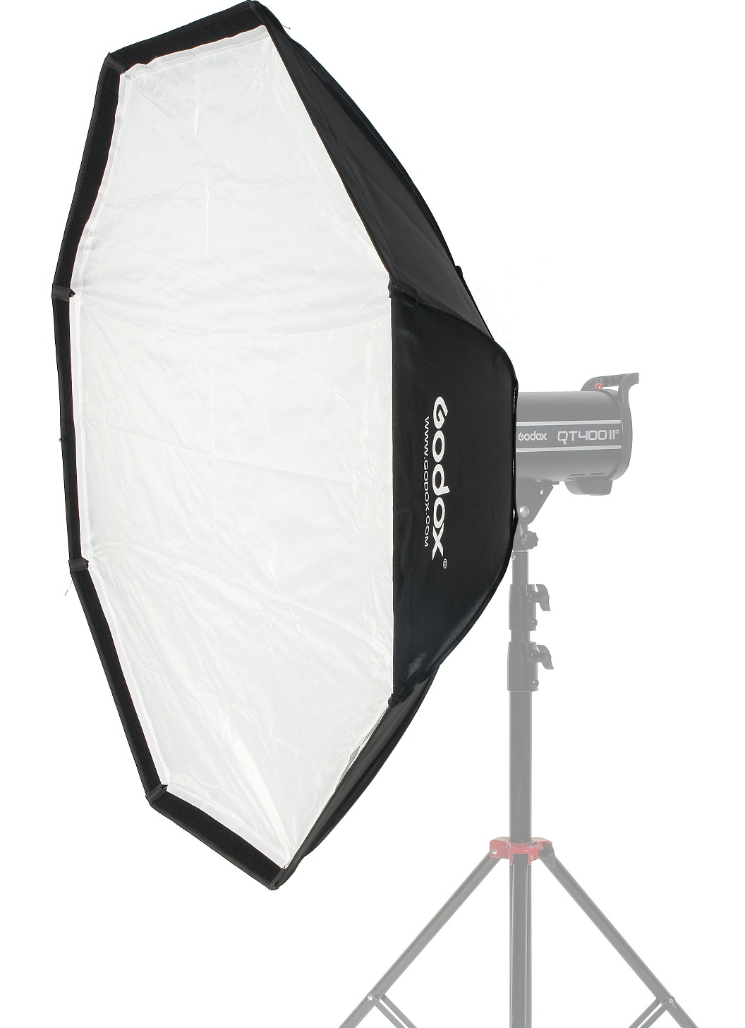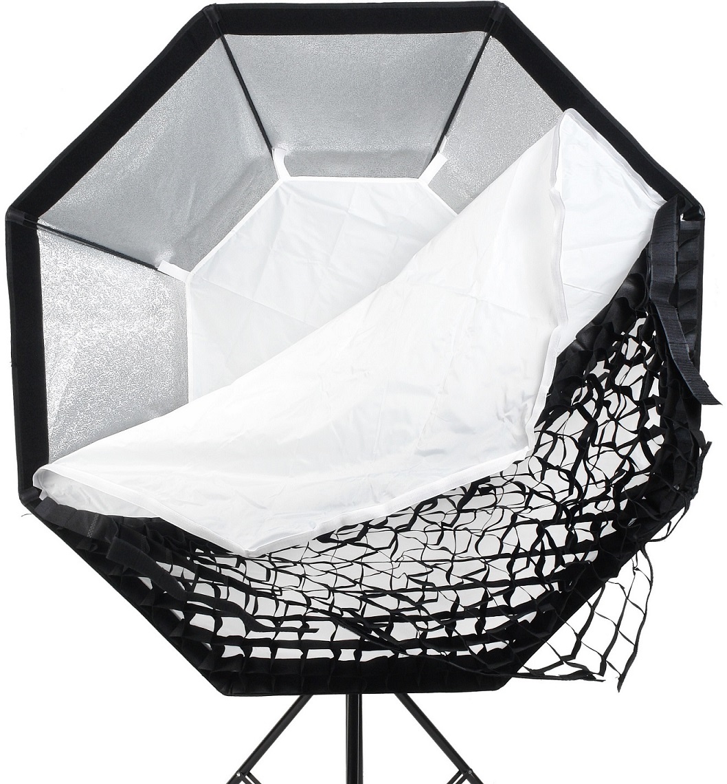 Закрытая конструкция исключает паразитные блики и потери светового потока. Отражающая серебристая поверхность обеспечивает равномерное распределение света внутри софтбокса, белые полупрозрачные рассеиватели делают свет более мягким.