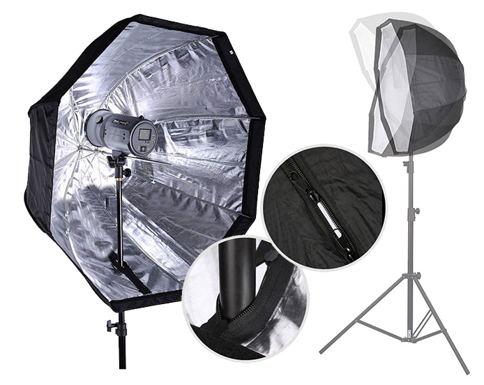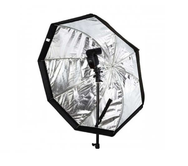 Октобокс-зонт предназначенный для равномерного освещения больших поверхностей и для получения практически круглого блика в глазах модели. Устанавливается в крепление для зонта. Данный октобокс легко собирается, т.к. имеет конструкцию зонта.