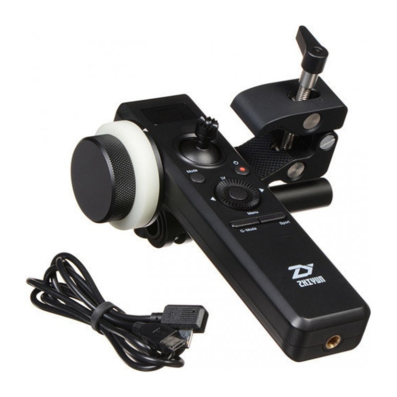 Слева - диск управления фокусом со светящимся в темноте покрытием. Пульт имеет функцию мимического контроля, благодаря встроенному гироскопу, который отслеживает углы наклона пульта. С помощью этой функции стабилизатор будет повторять движения пульта в пространстве. Оснащён OLED дисплеем, где отображаются все настройки стабилизатора и камеры.