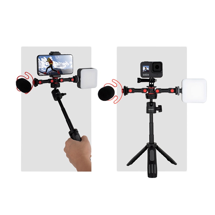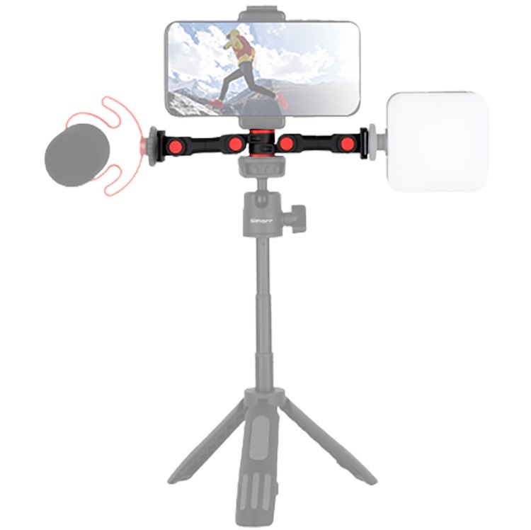 Универсальный двойной кронштейн с двумя креплениями холодный башмак. К его преимуществам можно отнести возможность установки сразу несколько устройств для повышения эффективности и качества работы. Сами держатели вращаются на 360°, что даёт гибкость в работе и настройке. Двойной кронштейн имеет нижний винт 1/4" для установки дополнительных аксессуаров или же закрепления конструкции на штативе. Выполнена конструкция из облегченного алюминиевого сплава.