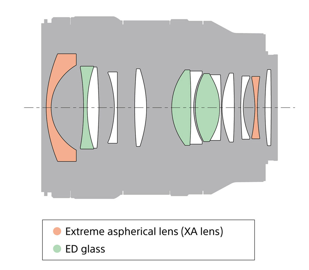 Два асферических элемента типа XA (экстремально-асферические) позволяют достичь одинаково высокого разрешения по всей площади изображения, что соответствует строгим стандартам серии G Master. Три низкодисперсионных стекла эффективно подавляют хроматические аберрации. Инновационная оптическая конструкция также минимизирует сагиттальные блики и обеспечивает точное воспроизведение точечных источников света.